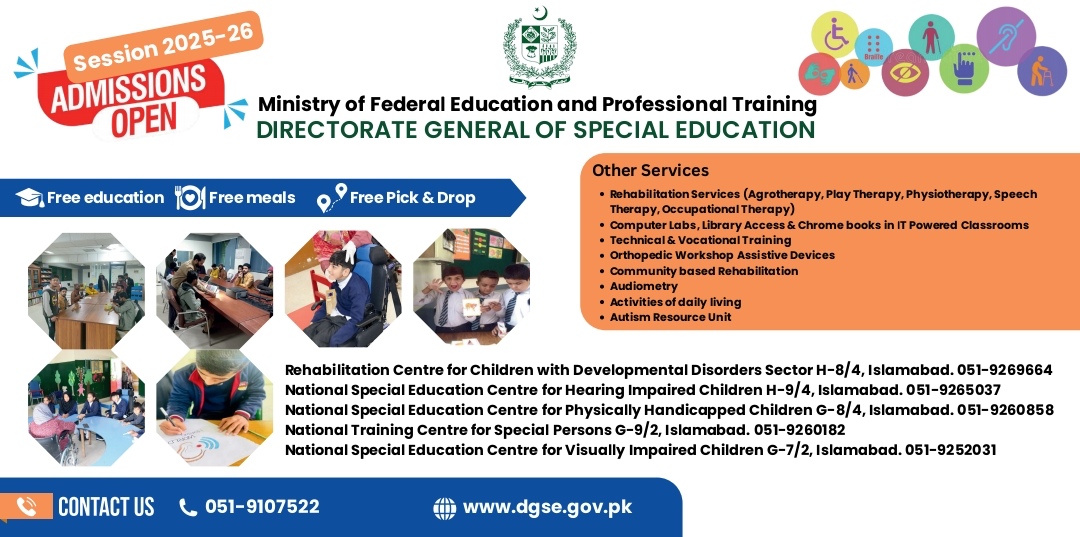 The Directorate General of Special Education (DGSE) has opened admissions for the 2025-26 session, reaffirming its commitment to empowering persons with disabilities for an inclusive future.